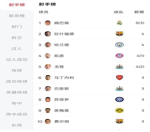 本赛季欧冠射手榜:姆巴佩5球居首,拉师傅&哈兰德4球紧随 雷速体育 2025-03-12 17:16:43 雷速体育10月22报道 北京时间今日,欧冠单夜九场精彩纷呈的比赛落幕,欧冠的射手榜也有所变动,拉什福德来到了第二,姆巴佩依旧五球居首。射手榜前十 欧冠 哈兰德 姆巴佩 射手榜 拉什福德 基利安·麦巴比 上一篇: 官方:哲凯赖什当选阿森纳40马竞一役全场最佳球员 下一篇: 巴尔德:这场胜利给了我们极大信心,希望在伯纳乌大胜皇马