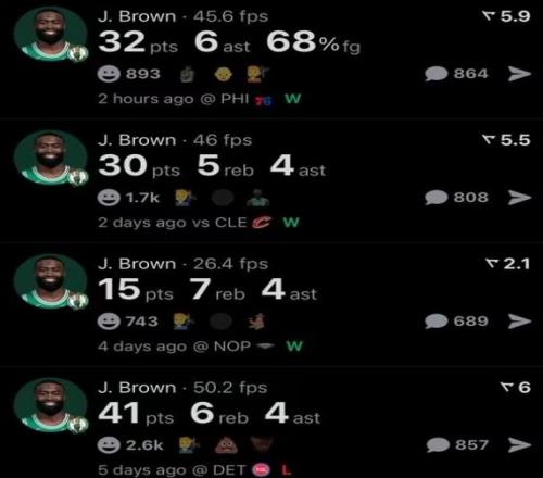 最近4场比赛,布朗4战有3场30+,还有1场40+,且命中率都在50%上下徘徊,算是彻底燃尽。