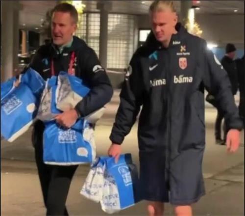 挪威队在4-1击败爱沙尼亚后几乎锁定世界杯席位,哈兰德在梅开二度后,又穿着球衣为队友买了近70个芝士汉堡。