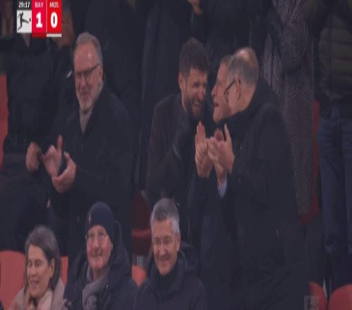 拜仁对阵美因茨的比赛中,场边镜头显示,穆勒与拜仁体育总监埃贝尔在看台上目睹小将伦纳特-卡尔为拜仁首开记录后,两人顿时喜笑颜开。