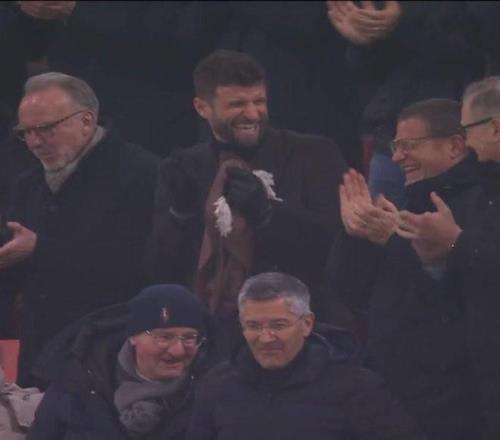 德甲第14轮拜仁主场对阵美因茨的比赛中,出现温情一幕:第29分钟格纳布里助攻小将卡尔打破僵局后,看台上的穆勒兴奋得如同孩童般手舞足蹈、开怀大笑。坐在他身旁一同欢呼的正是拜仁体育总监埃贝尔等俱乐部管理层成员。