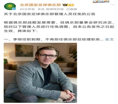 上午10点官宣!李明不再担任北京国安总经理,德国人马永明接班