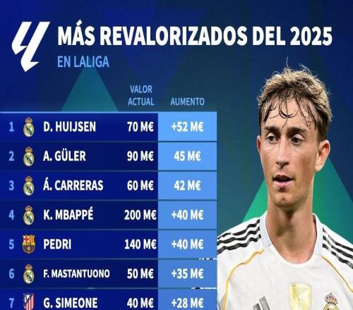 西甲2025年身价涨幅TOP15:赫伊森上涨5200万第1,姆巴佩第4 -