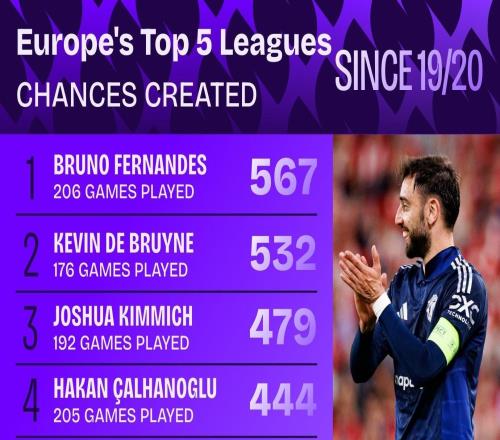 1920赛季起五大联赛创造机会榜:B费567次第1,丁丁532次第2 -