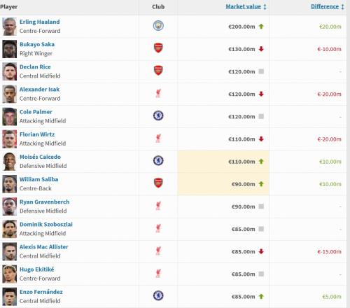 英超球员身价更新:哈兰德涨至2亿欧,萨卡降至1.3亿欧 -