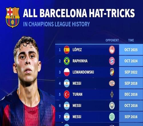 欧冠改制以来巴萨球员戴帽榜:梅西8次居首,费尔明上榜
